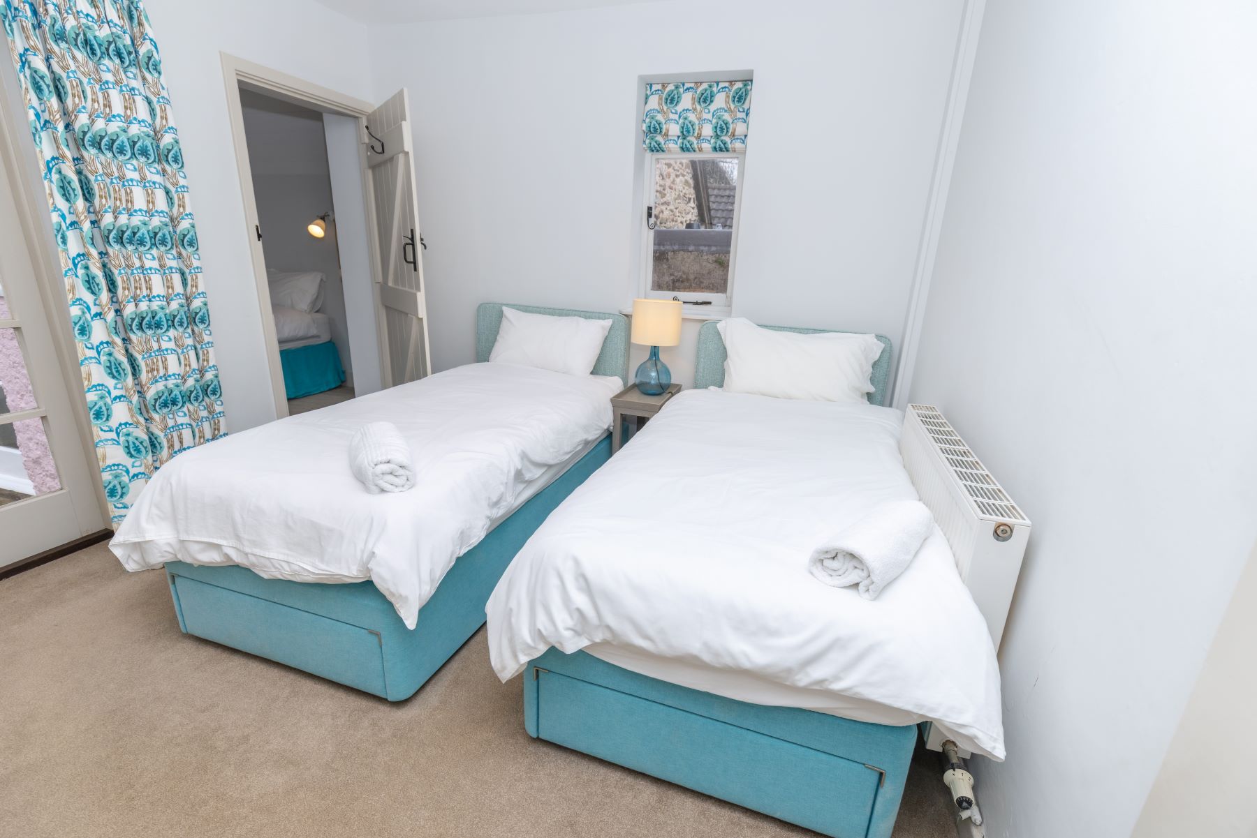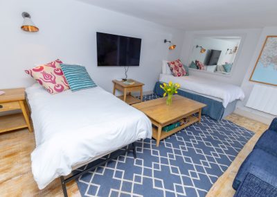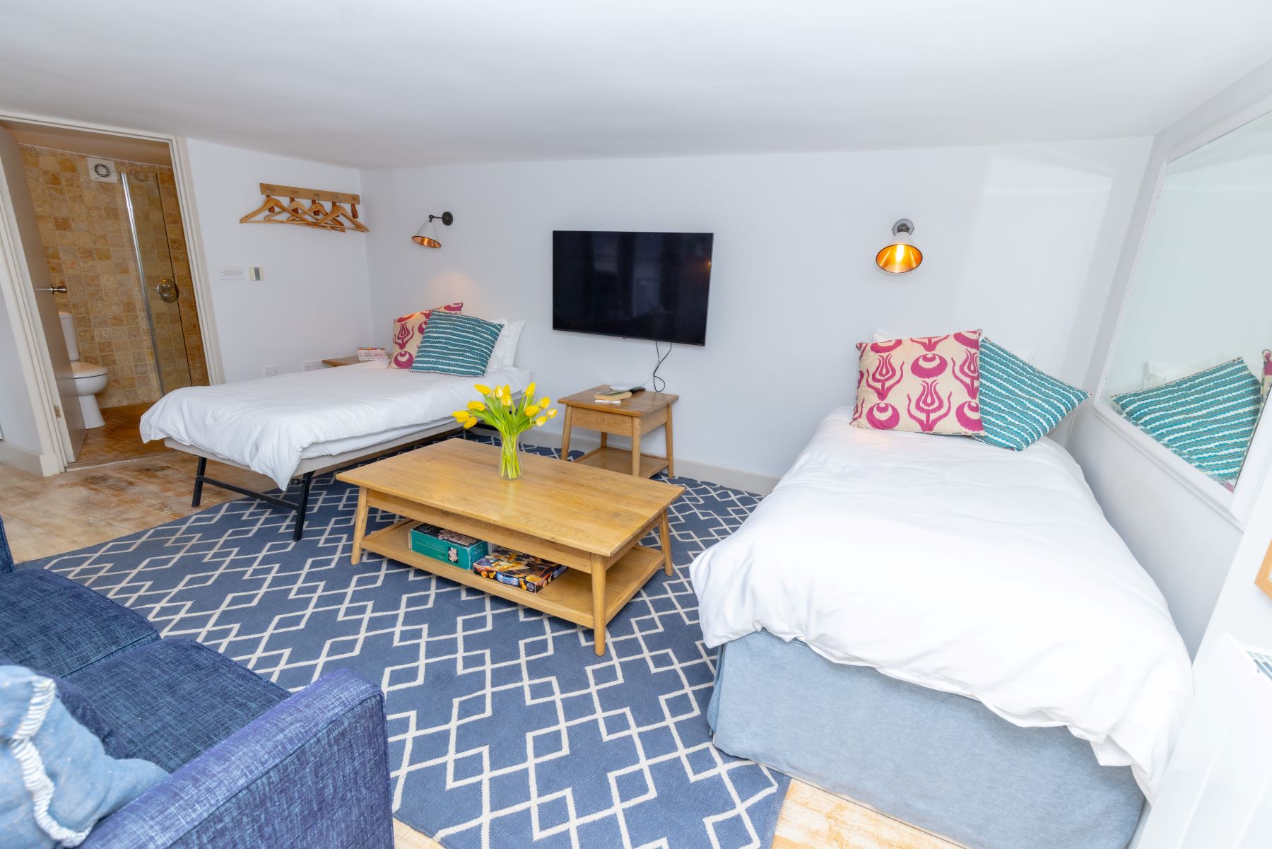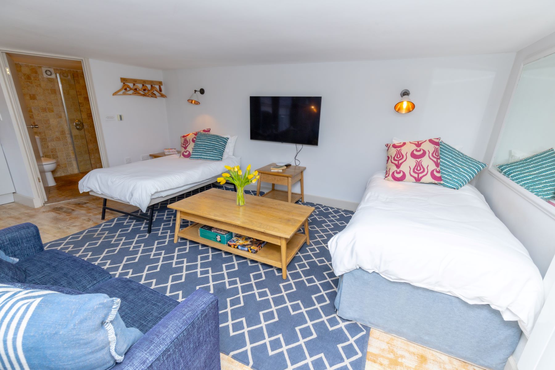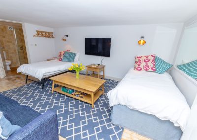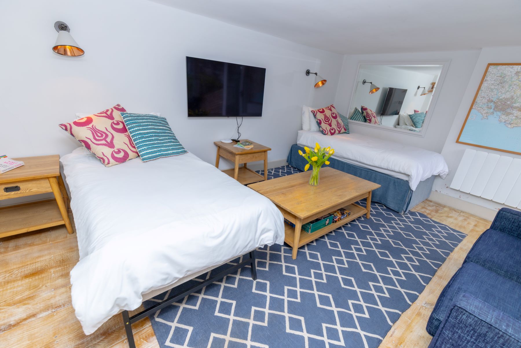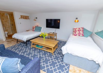 • Studio annex just across the lane from the main house, with kitchenette (microwave, fridge, kettle, sink), sofa, table and chairs for two, and shower wet room with toilet and wash basin. Features full-height folding doors offering stunning estuary views. There is also a utility area with washing machine and tumble drier, and storage area ideal for beach or sailing gear. This space can be set up as Bedroom 4 when requested in advance – arranged as two singles or a double.