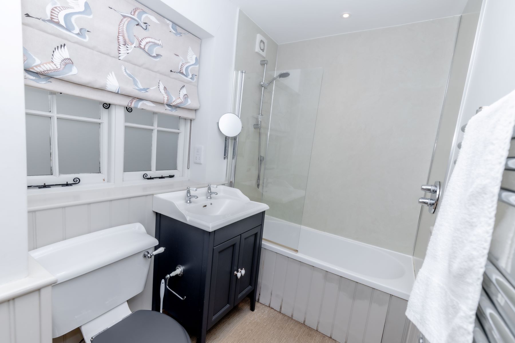• Family bathroom has bath with shower over, toilet, wash basin and heated towel rail.