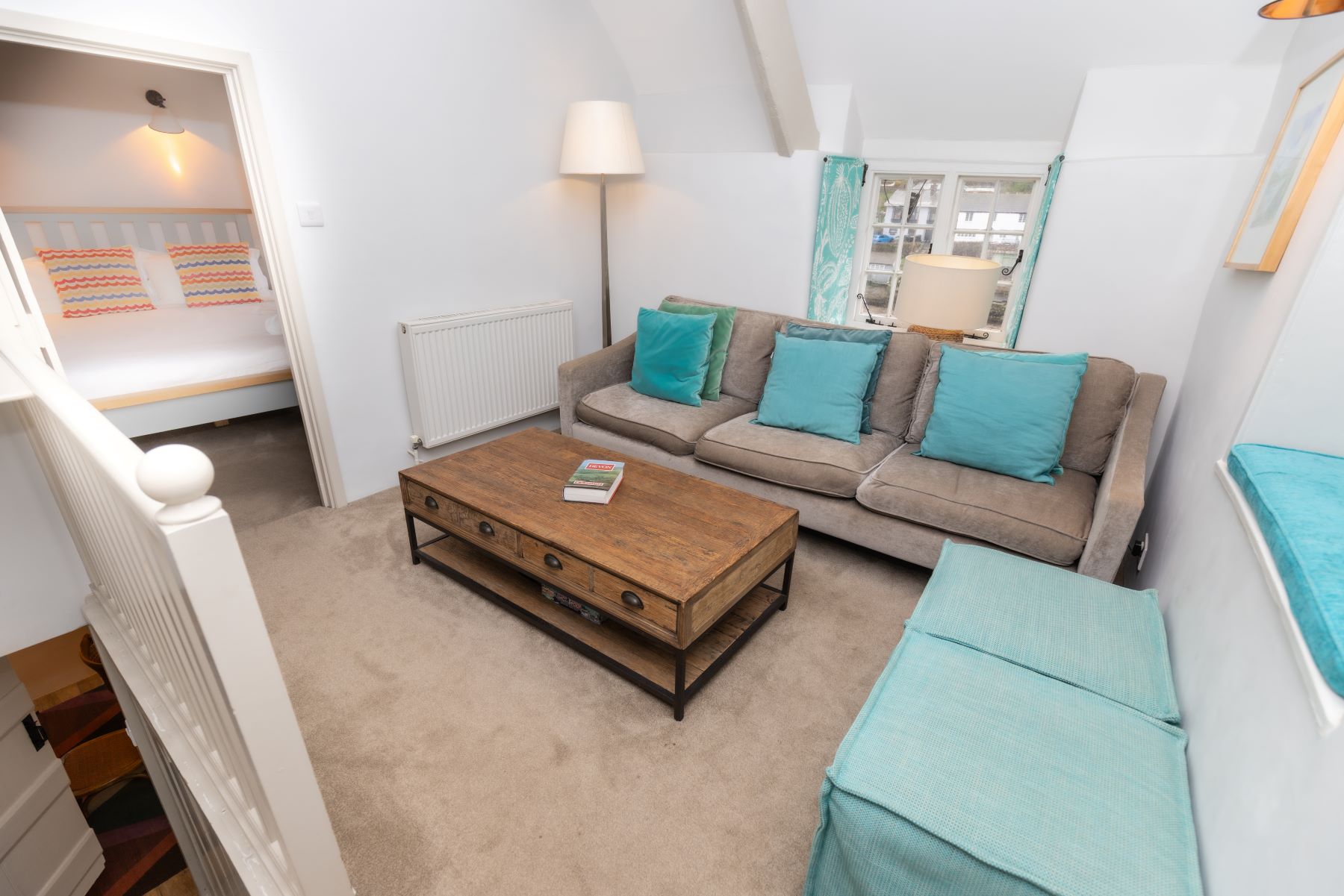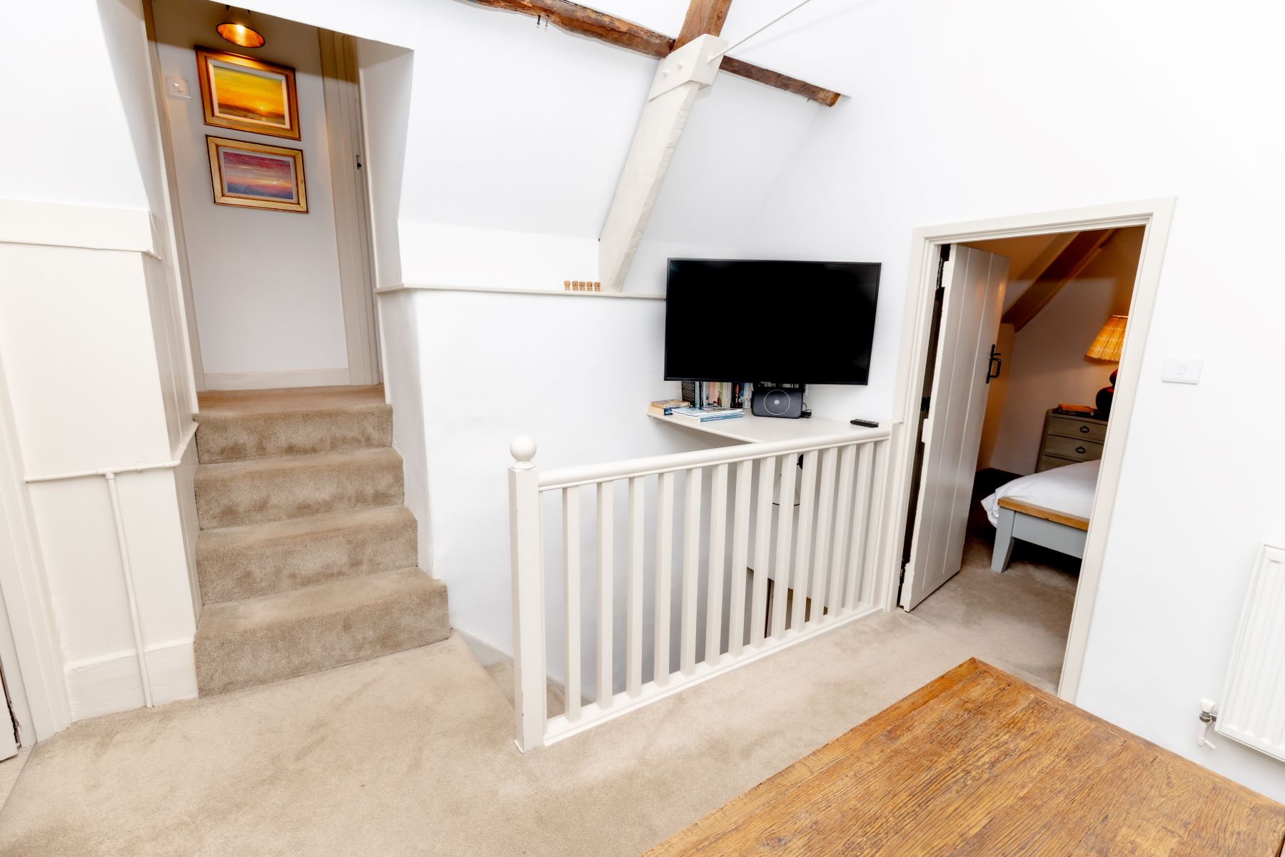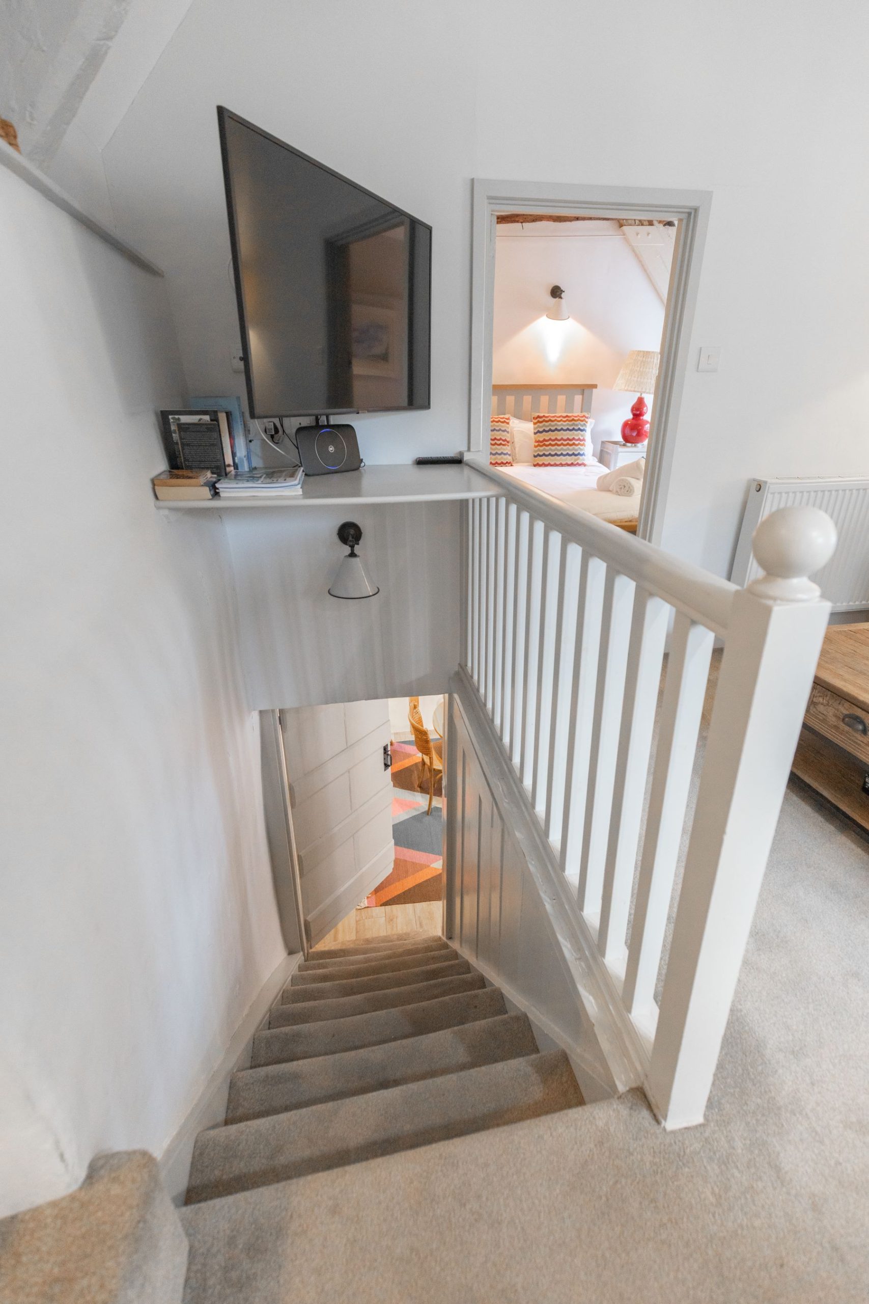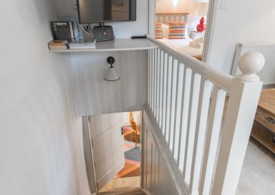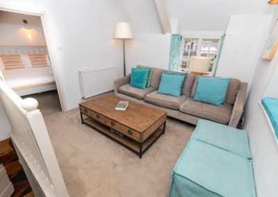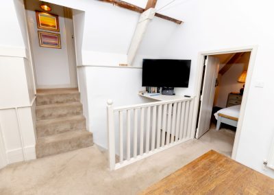 • Staircase (be careful of low doorway at the bottom – 5’9”) leading up to open lounge area on first floor, with large sofa, soft seating cubes, window seat and Smart TV.