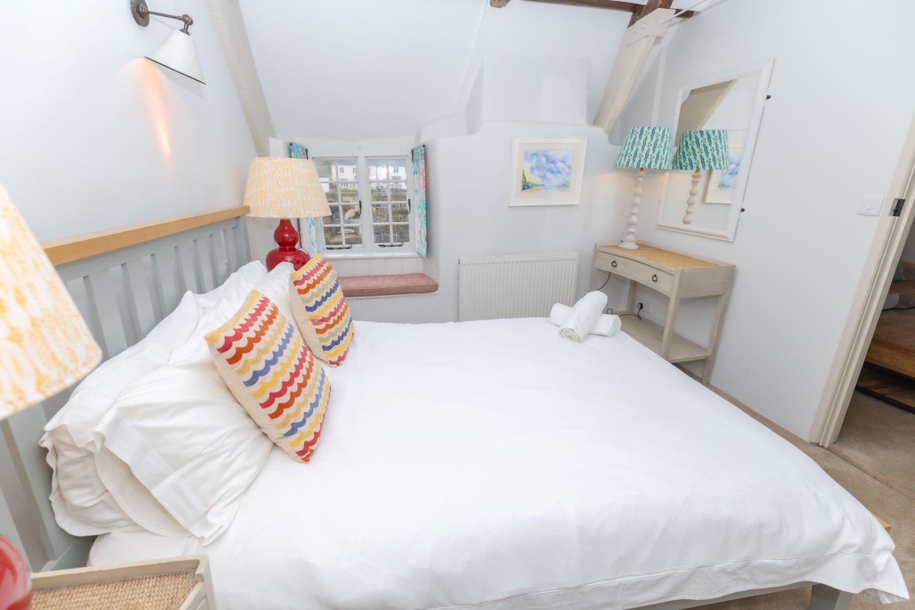 • Master bedroom has king size double bed, window seat with estuary views, bedside cabinets, console table, and vaulted ceiling with exposed wooden beams.